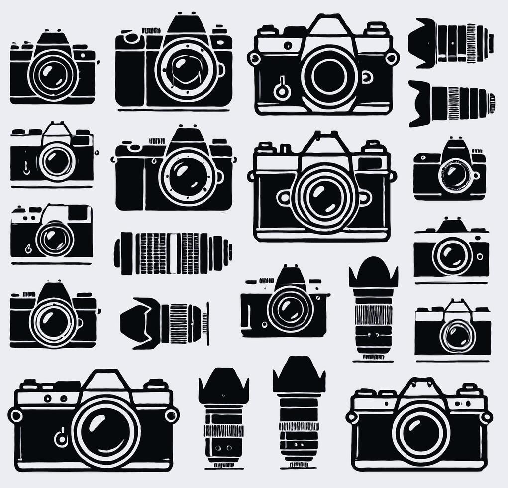 Minimalist clear silhouettes of various camera items on a white background with sharp lines. Camera icons set. Simple illustration. Free Vector