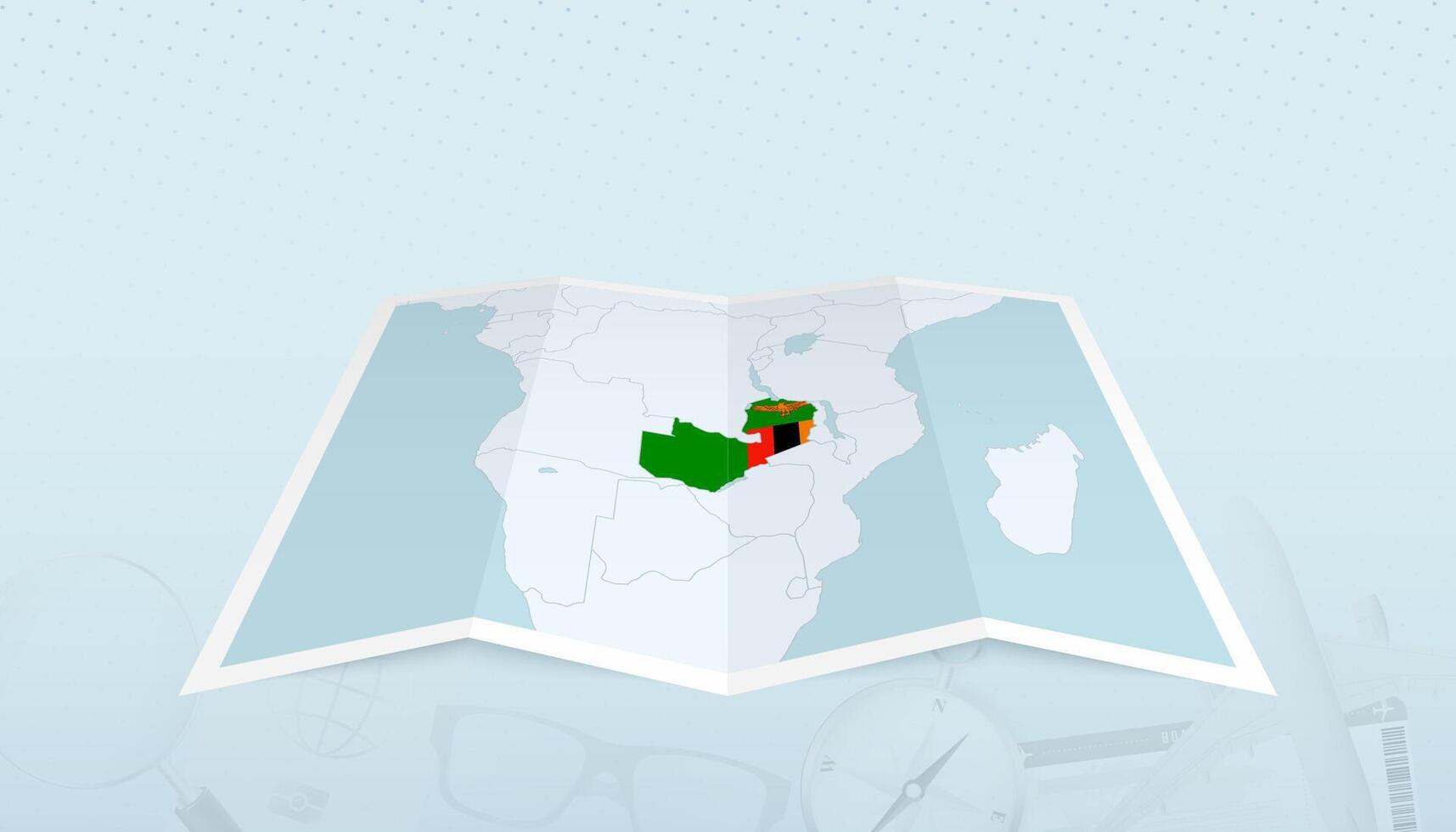 Map of Zambia with the flag of Zambia in the contour of the map on a trip abstract backdrop. Pro Vector