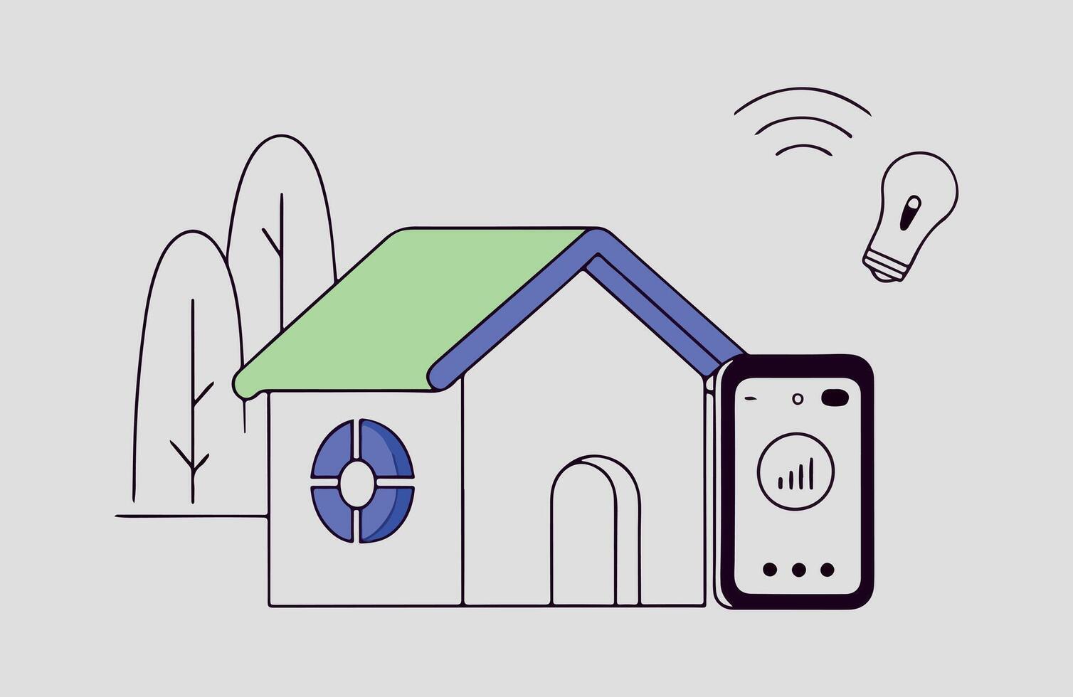 Smart home with connected devices like security cameras, lighting, thermostat, and washing machine controlled via a mobile app. vector