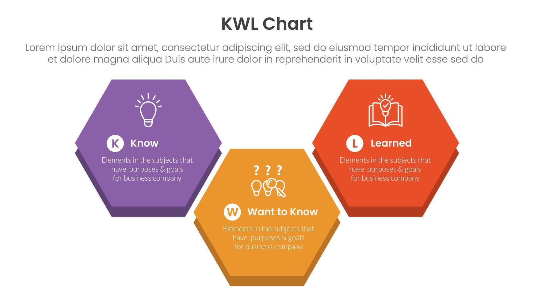 KWL Chart infographic 3 point with big hexagonal up and down shape for slide presentation vector