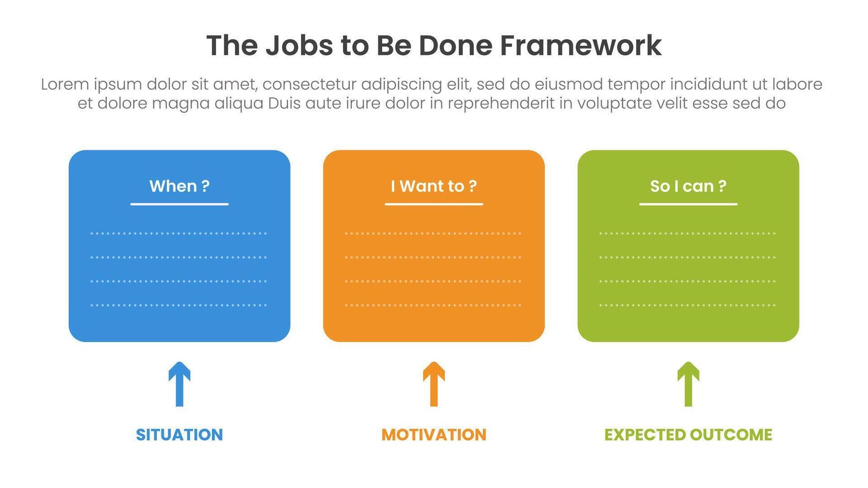 JBTD framework infographic template banner with round description box container and arrow with 3 point for slide presentation Pro Vector