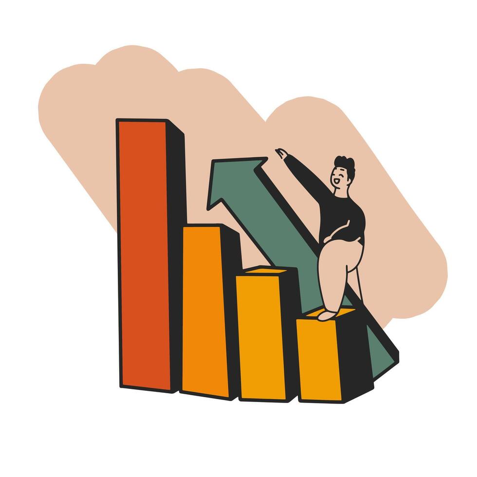 Business concept. Data analytics. Sales growth chart. Business graph. Sales skyrocket. Businessman rejoices at a successful startup. Up arrow. Marketing strategy. Statistical data Pro Vector