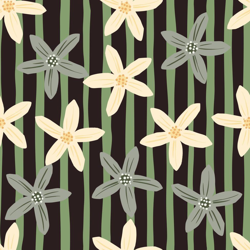 Exotic seamless pattern with random bloom flowers mandarin elements shapes. Green striped background. Pro Vector
