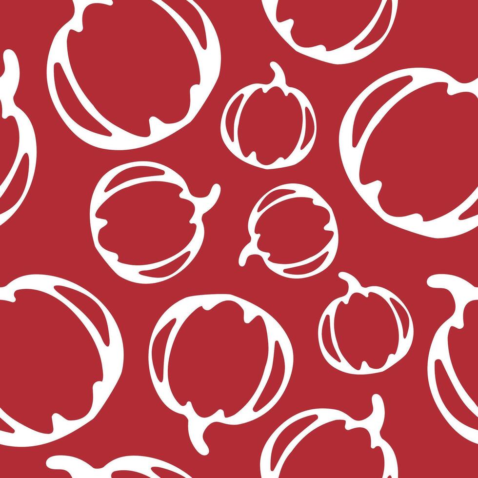 seamless autumn pattern with pumpkins drawn with a white outline placed chaotically on a dark red background vector