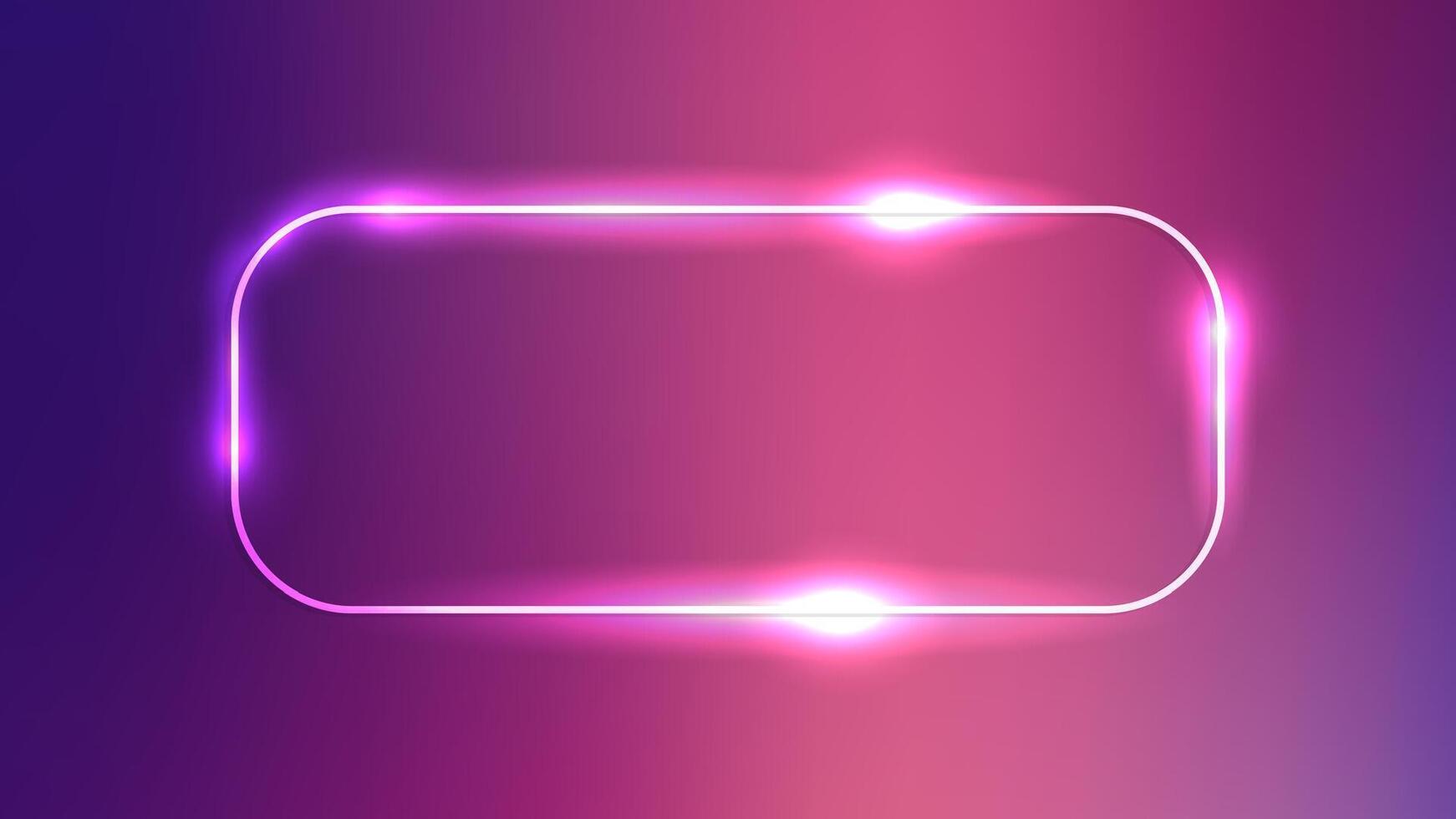 Neon rounded rectangle frame with shining effects on dark purple background. Empty glowing techno backdrop. illustration Pro Vector