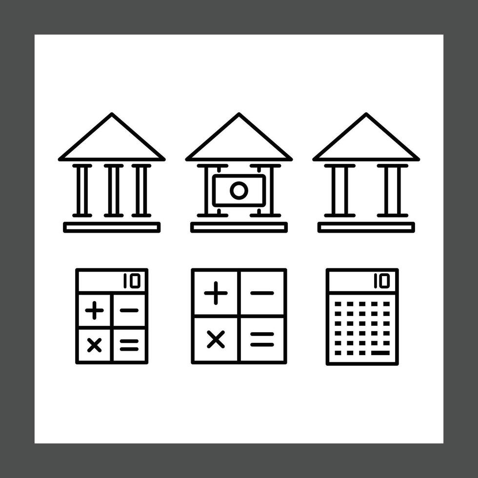 Three simplified bank building icons with columns and roofs, accompanied by two calculator-style grids featuring mathematical symbols Pro Vector