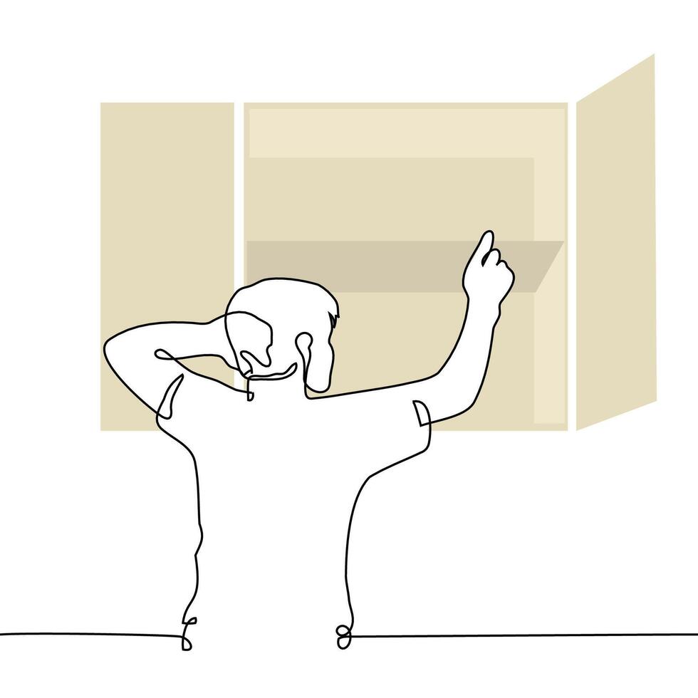 man reaching for empty shelf and scratching his head - one line art . concept empty shelves, out of stock Pro Vector