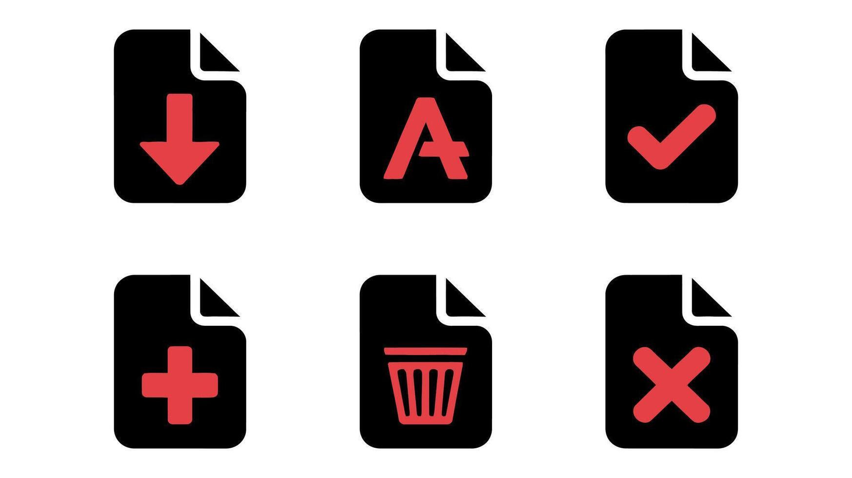 Document and File Management Icons Download, Delete, Edit, Checkmark, Add, Red UI Symbols, Data Organization, Digital Storage, Folder Actions, System Controls Pro Vector