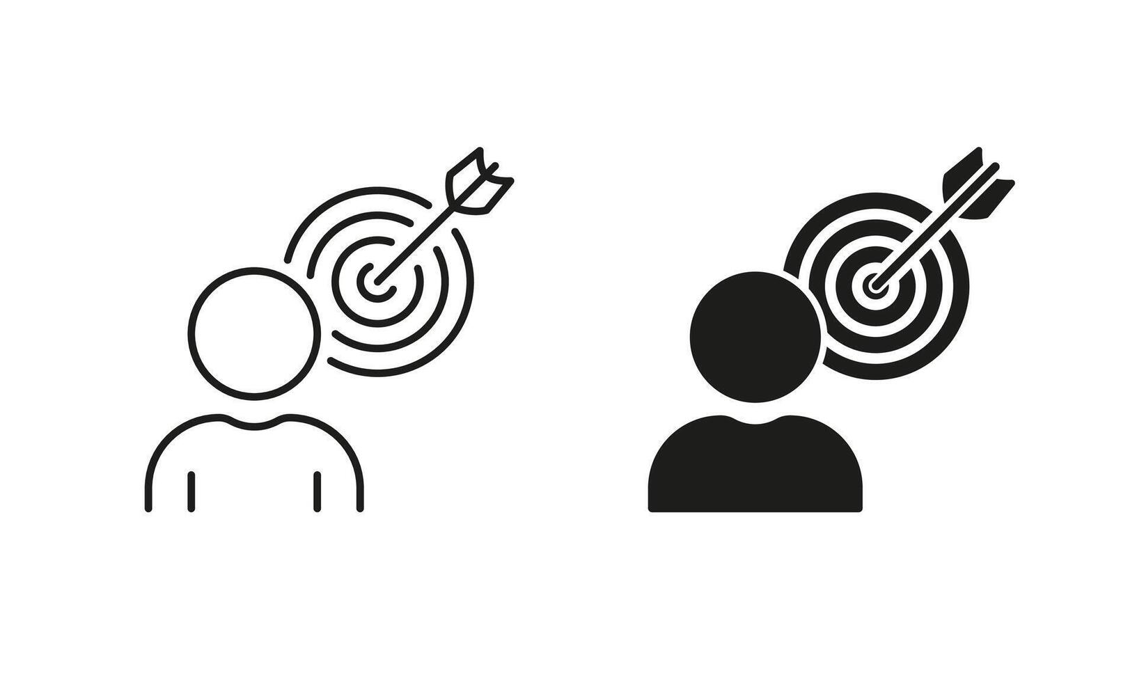 Goal Strategy, Aim Focus Pictogram. Person with Target Line and Silhouette Icon Set. Objective Oriented Human. Dartboard Bullseye and Arrow. Editable Stroke. Isolated Illustration Pro Vector