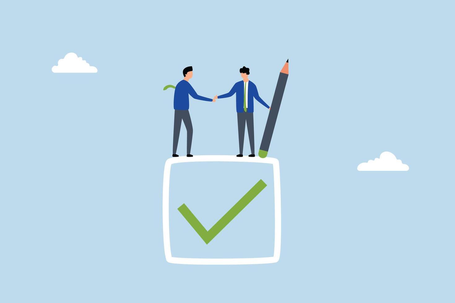 Commitment, businessman handshake on tick completed checkbox Pro Vector