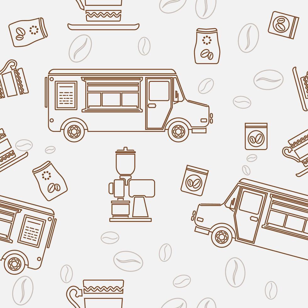 Editable Side View Mobile Coffee Van Shop With Brewing Equipment Vectorized Illustration Seamless Pattern in Outline Style for Creating Background of Cafe Related Concept Purposes Pro Vector