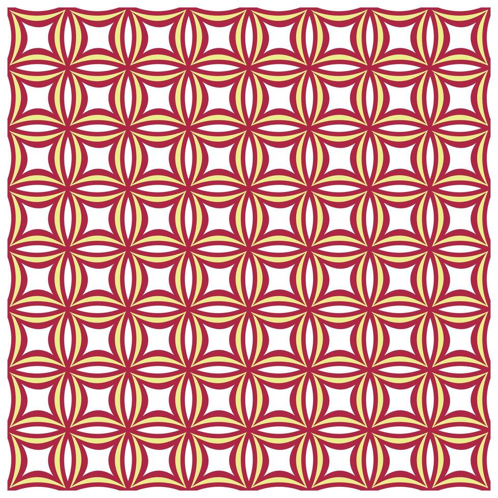 A repetitive geometric pattern featuring interlocking red and yellow shapes against a white background, creating a floral design. Pro Vector