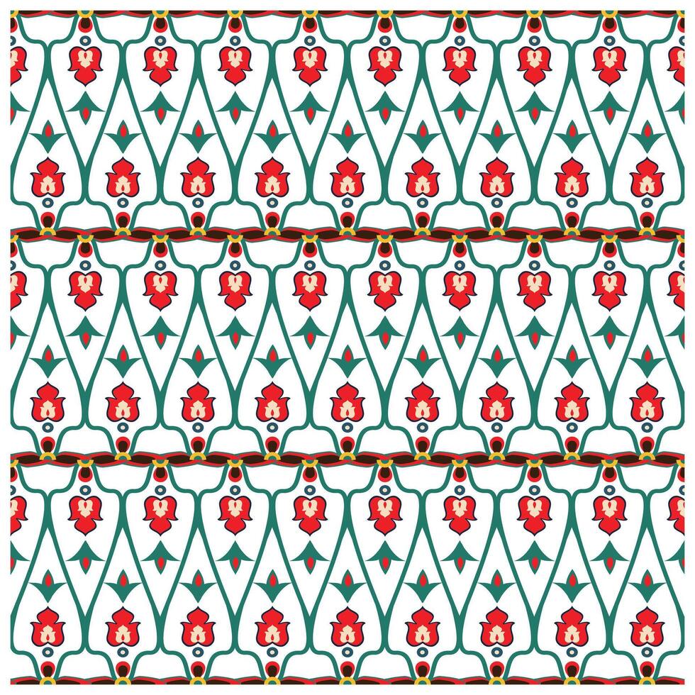 A repeating pattern featuring floral motifs in red, outlined in green, set against a white background with decorative elements. Pro Vector