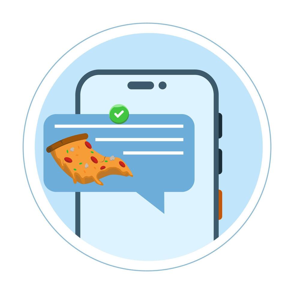 food notification concept. Phone with pizza notification on screen, flat cartoon phone with food delivery notification, smart phone with speech bubble and check mark. design. Pro Vector