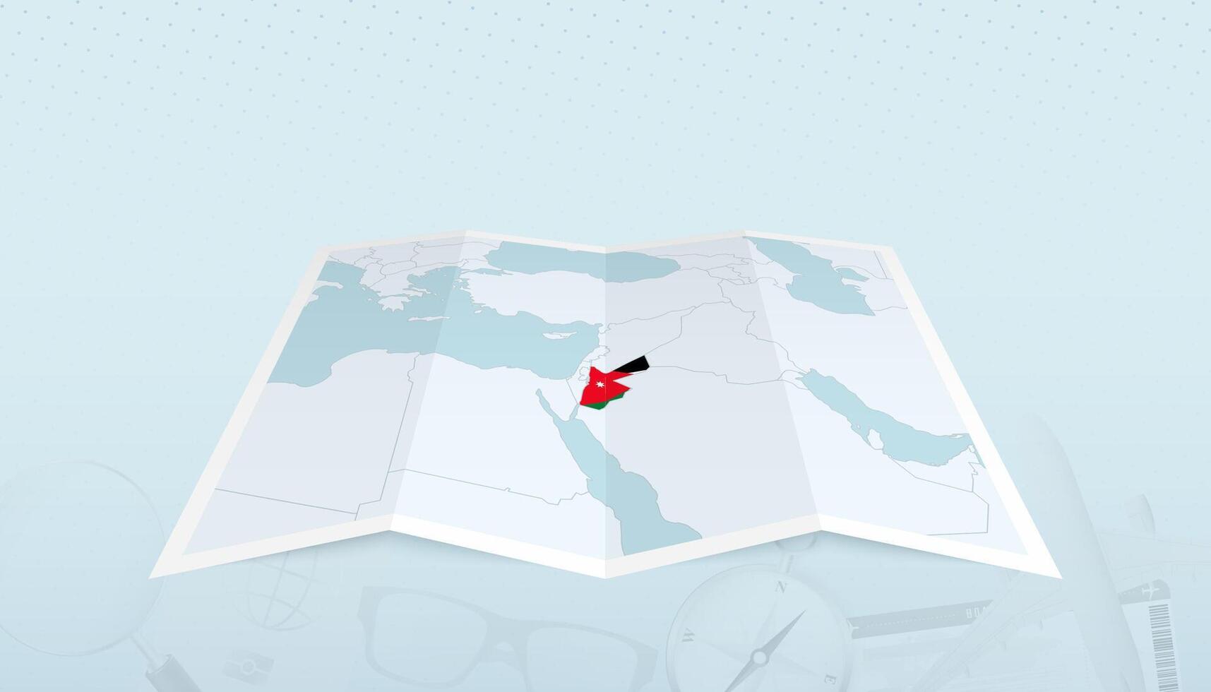 Map of Jordan with the flag of Jordan in the contour of the map on a trip abstract backdrop. Pro Vector
