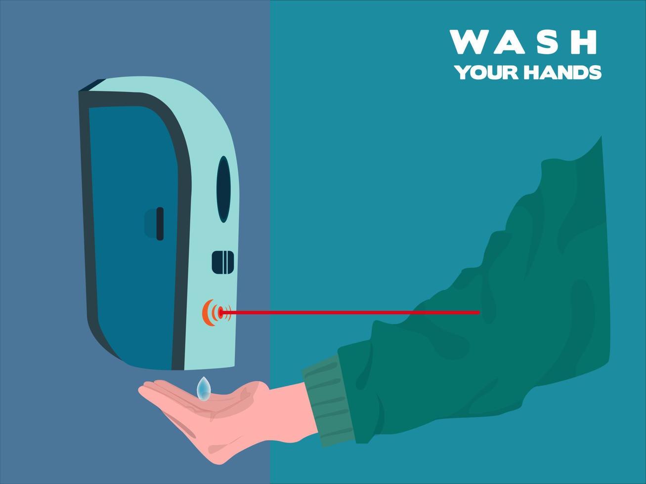 Young man uses an automatic hand sanitizer dispenser. And has an infrared light system It detects objects by temperature before dispensing alcohol gel. vector