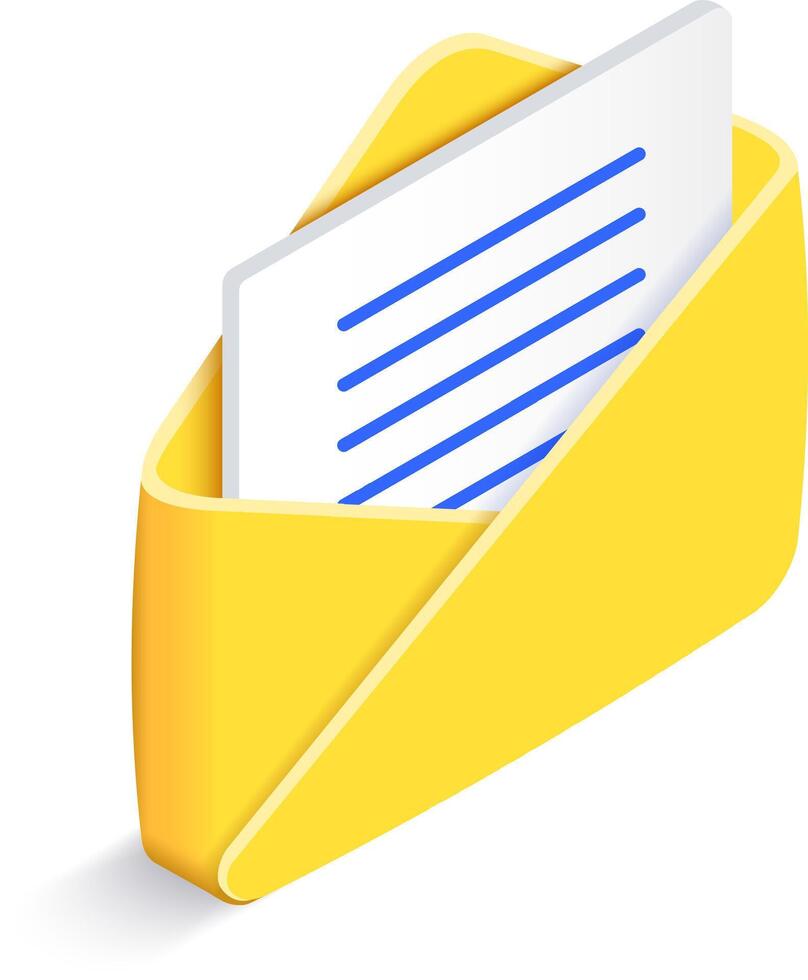 Yellow open isometric envelope containing letter with blue lines is sending a message, representing communication, messaging, email, and online correspondence Pro Vector