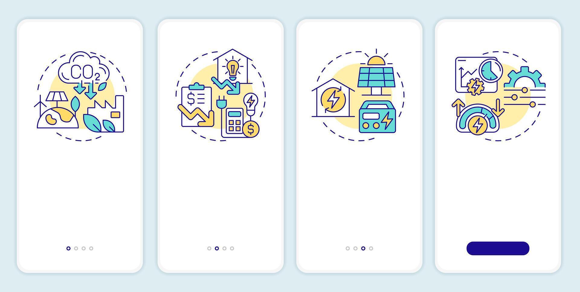 Energy management benefits onboarding mobile app screen. Walkthrough 4 steps editable graphic instructions with linear concepts. UI, UX, GUI template Pro Vector