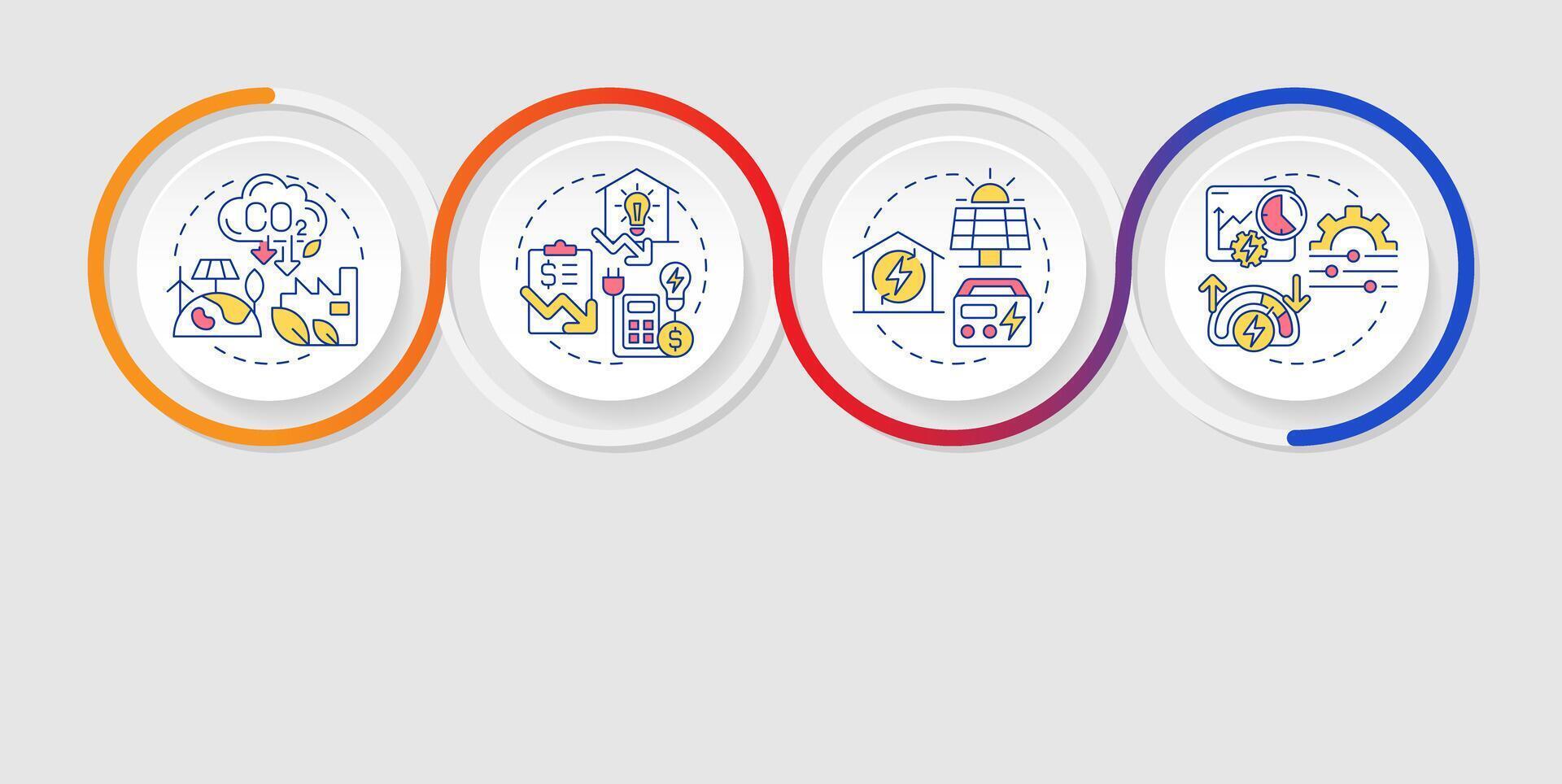 Energy management systems benefits infographics circles sequence. Carbon emissions, pollution. Visualization layout with 4 steps. Info chart loop process presentation Pro Vector
