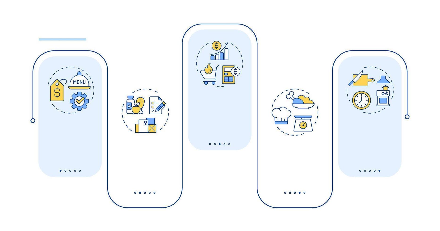 Restaurant management rectangle infographic . Menu engineering in catering business. Data visualization with 5 steps. Editable rectangular options chart Pro Vector
