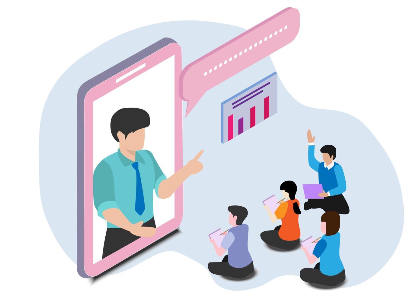 Online course with lectures on smartphone screen and a group of schoolchildren writing in notebooks. vector