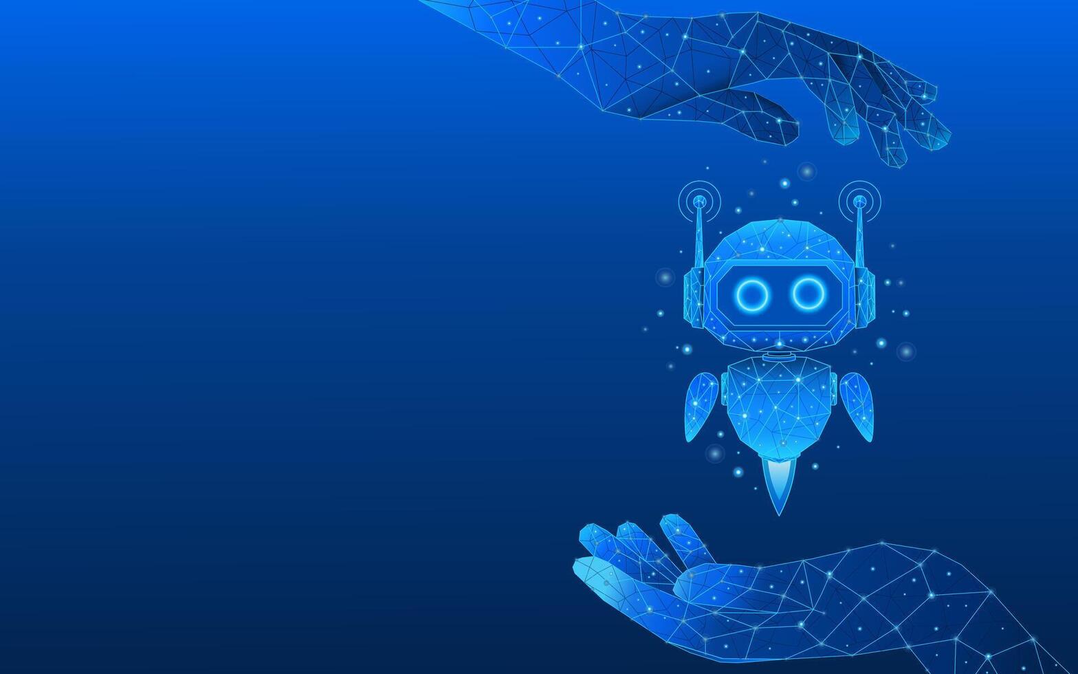 Two digital hands holding a 3D abstract digital Robot in wireframe. Pro Vector