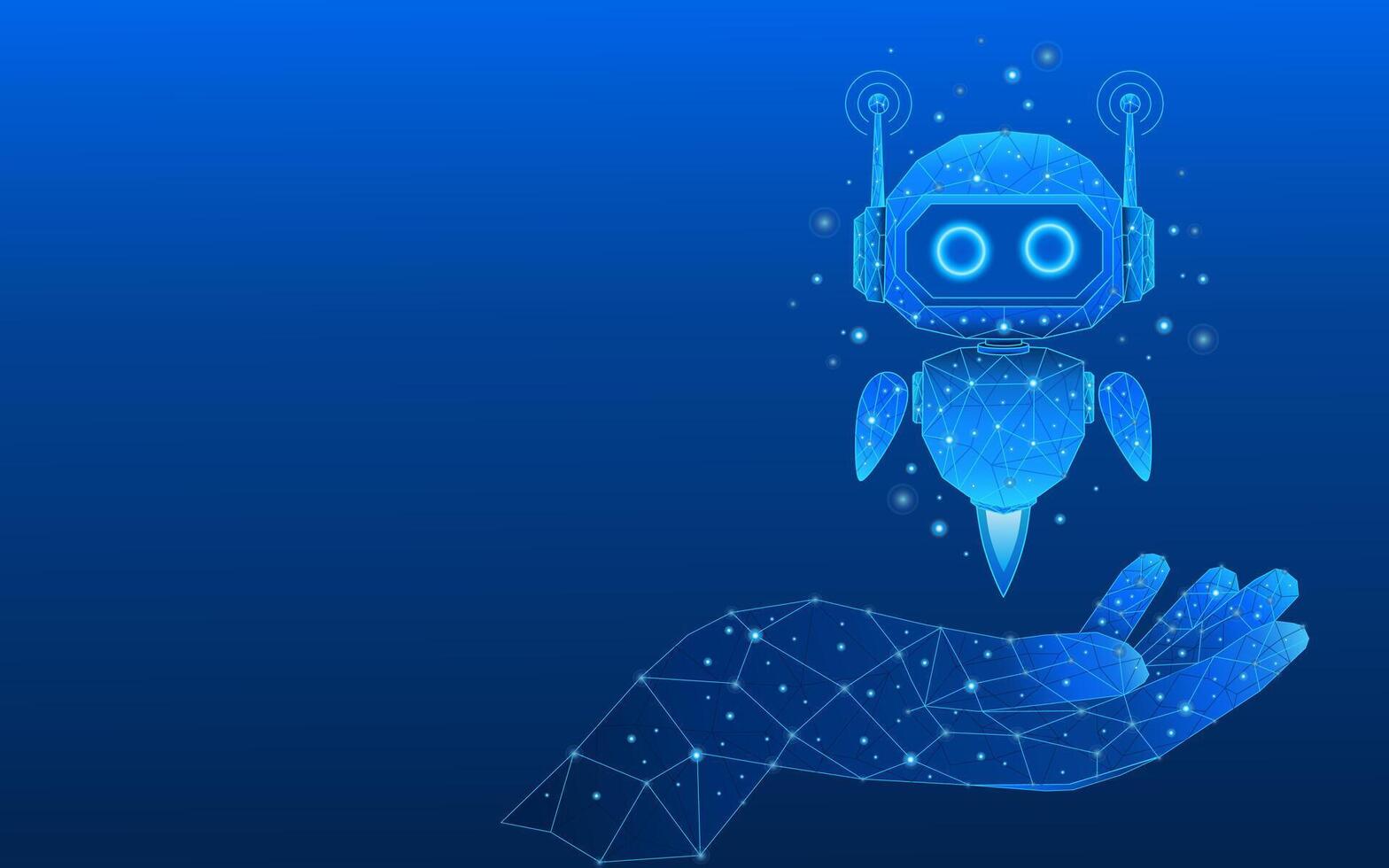 Abstract 3D digital AI robot floating above a wireframe human hand. Pro Vector
