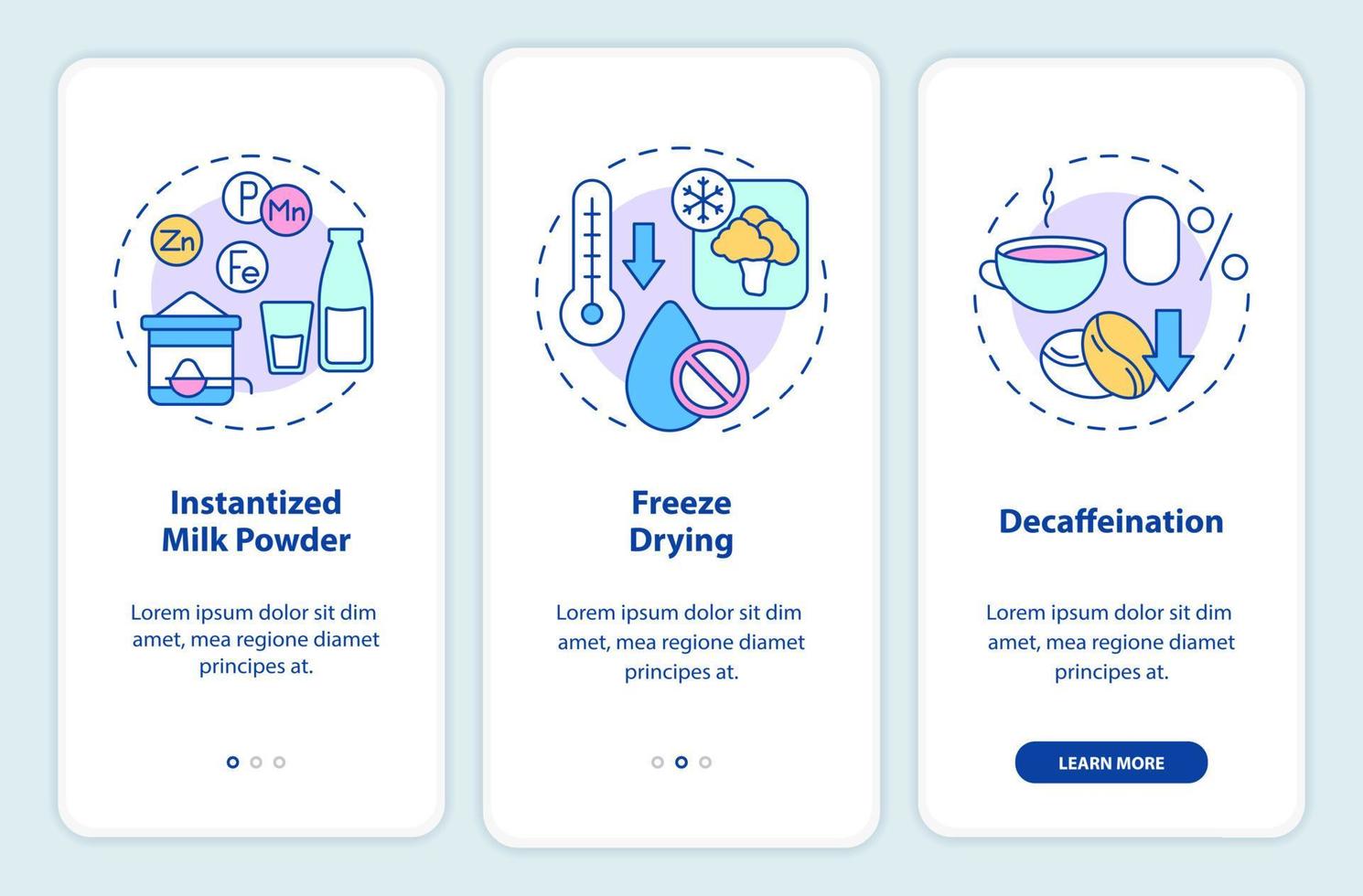 Food technology onboarding mobile app screen. Processing products walkthrough 3 steps graphic instructions pages with linear concepts. UI, UX, GUI template. Myriad Pro-Bold, Regular fonts used Pro Vector