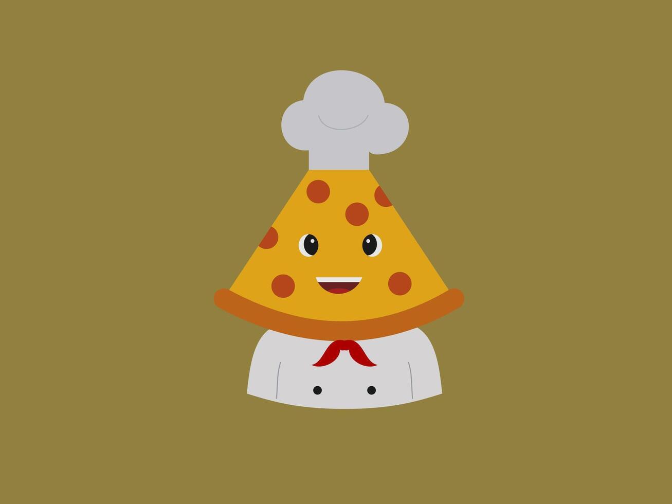 This image features a cartoon illustration of a chef with the unique twist of the chef hat being shaped like a slice of pizza Pro Vector