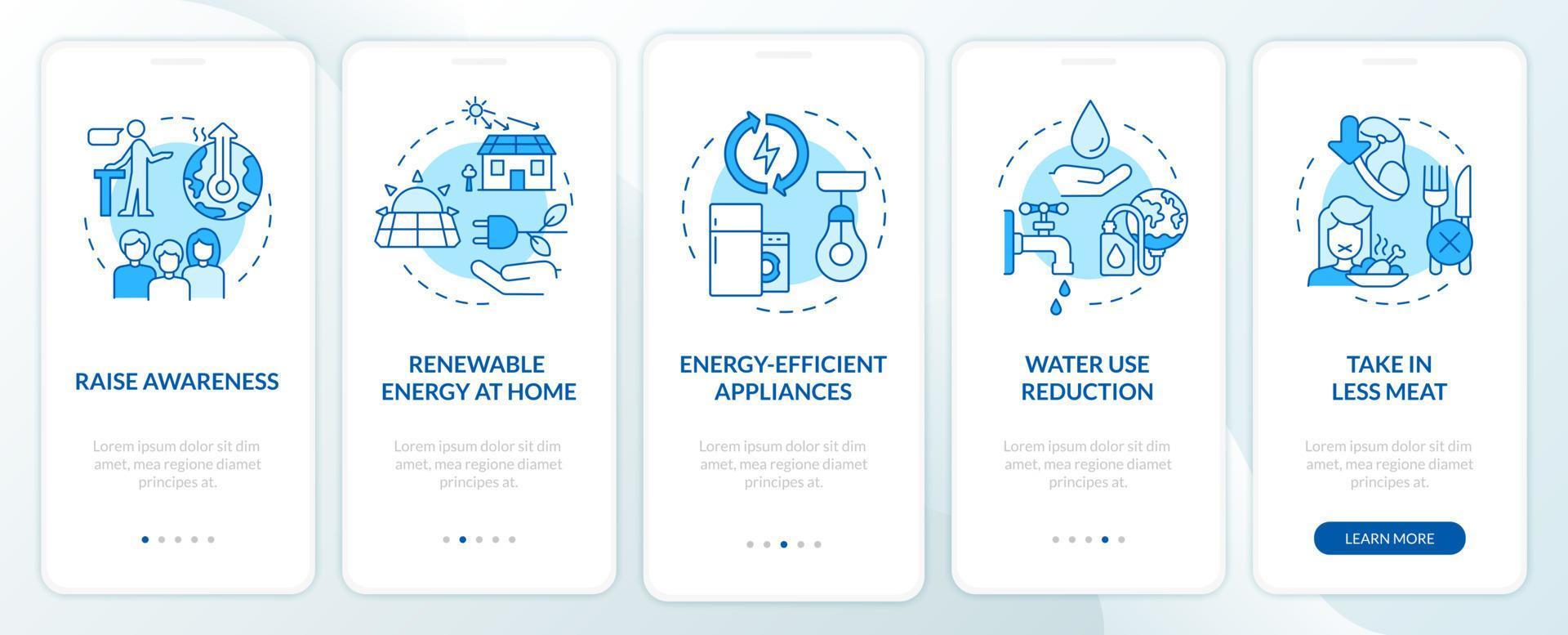Preventing climate changes blue onboarding mobile app screen. Walkthrough 5 steps graphic instructions pages with linear concepts. UI, UX, GUI template. Myriad Pro-Bold, Regular fonts used Pro Vector