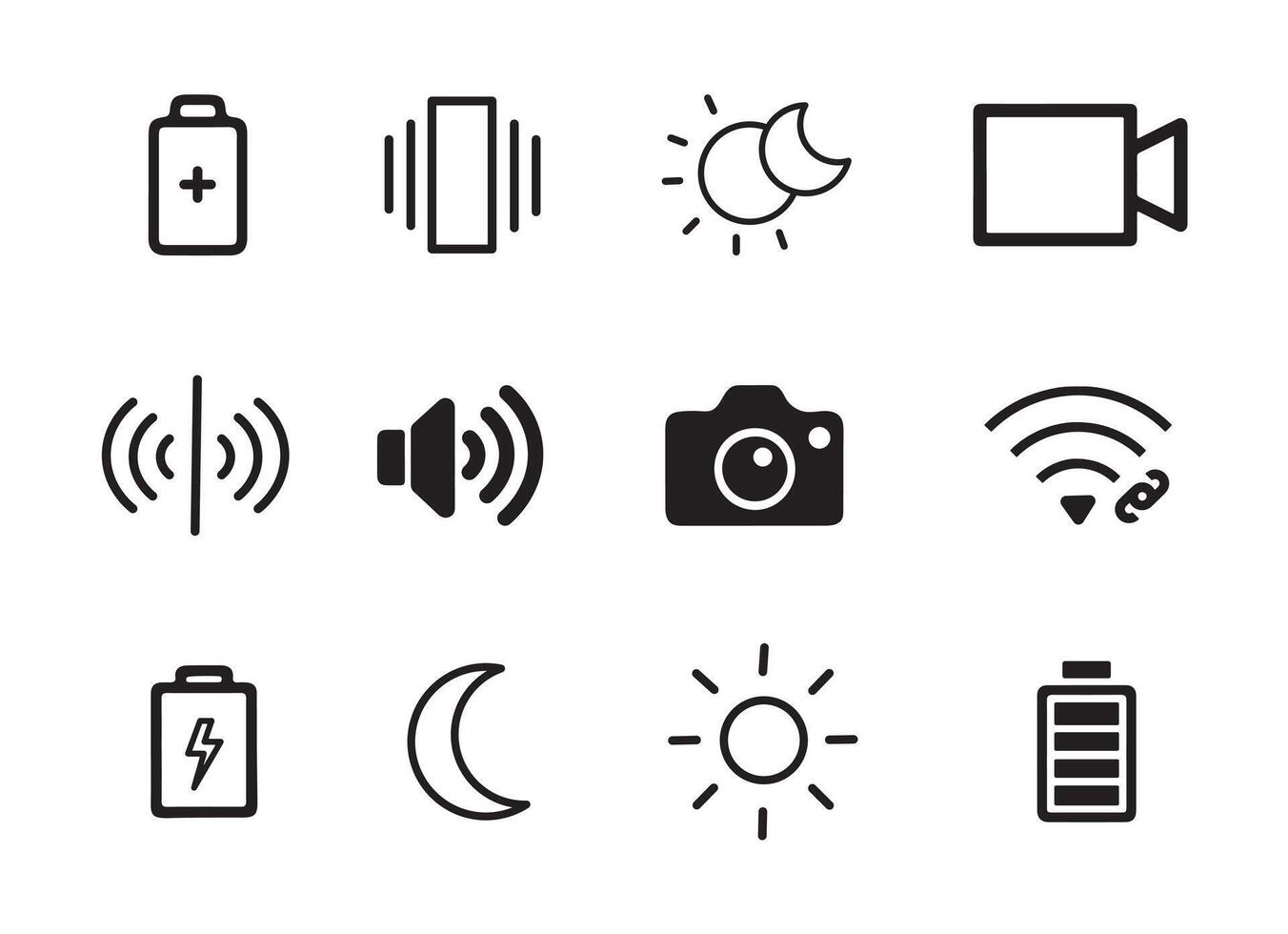 Essential Multimedia and Interface Icons. Battery, Vibration, Brightness, Camera, Sound, and Connectivity Pro Vector