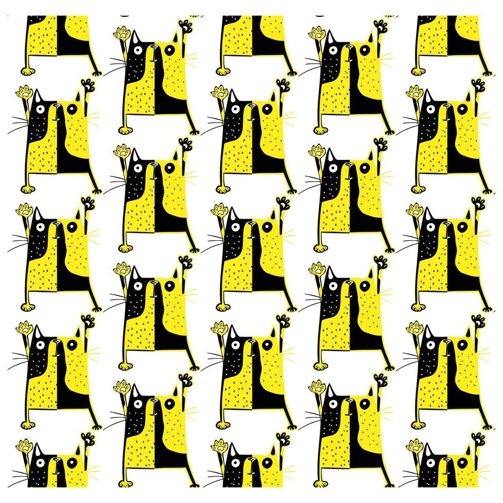 Pattern of whimsical, cartoon style black and yellow cats with quirky expressions, displayed in a repeating grid on a white background. Pro Vector