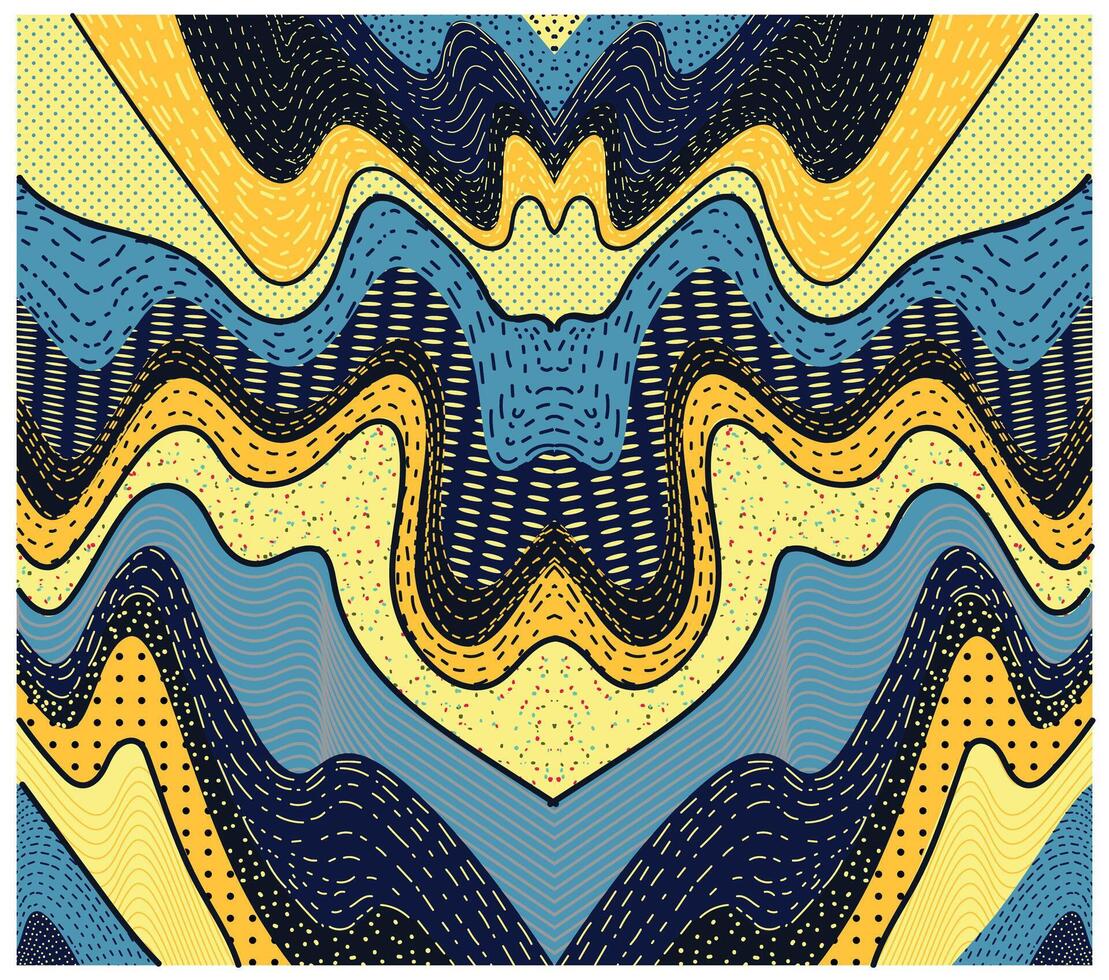 Abstract wavy patterns in shades of blue, yellow, and navy, featuring varied textures and dotted designs, creating a dynamic visual flow. Pro Vector