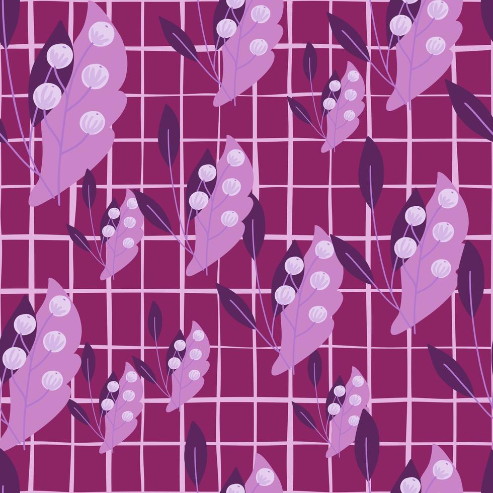 Random lilac rowan berries and foliage elements seamless pattern. Purple chequered background. Abstract print. Pro Vector