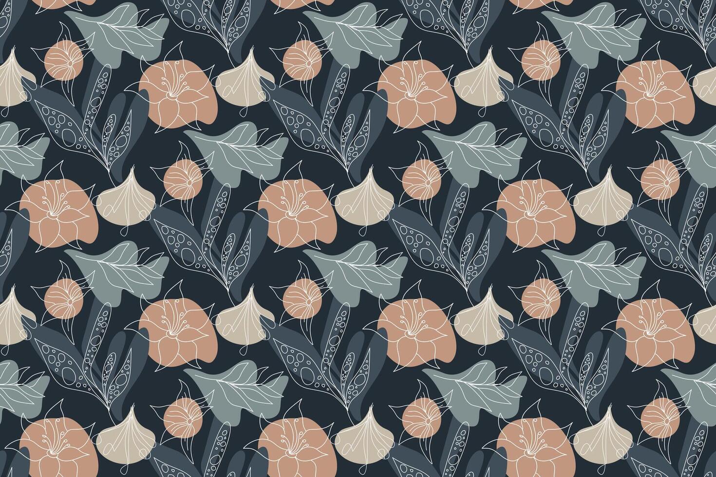 Seamless pattern with delicate line art flowers and abstract shapes in soft blush and blue tones on a dark background. Perfect for wallpaper, textiles Pro Vector