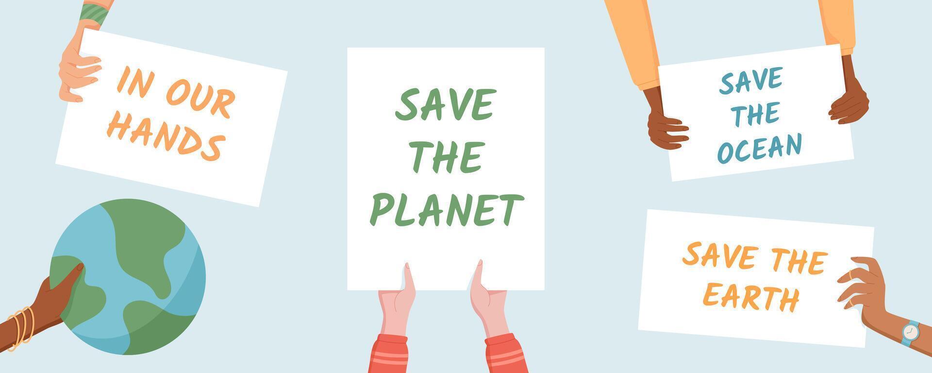 Hands hold environmental protest signs with messages like 'Save the Planet' and 'In Our Hands'. This ecology template highlights a eco demonstration with solidarity, support, and strength in unity. Pro Vector