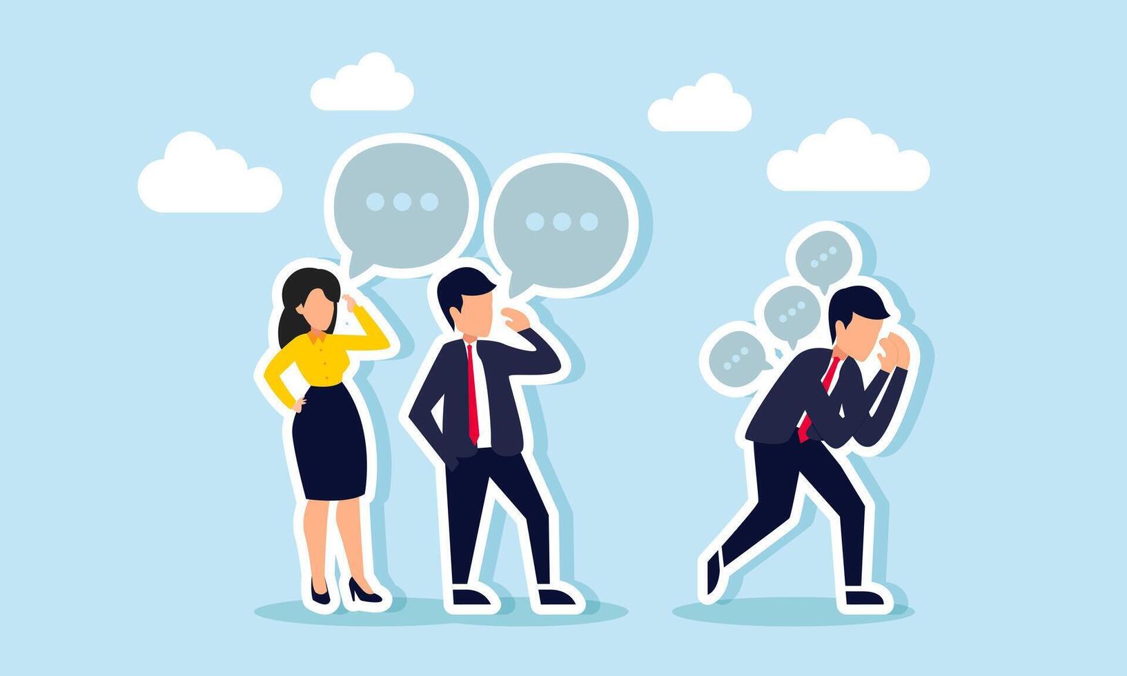 Two businessmen are discuss something, create chat dialogs, while another businessman looks frustration as negative messages, illustration of frustration from business criticism Pro Vector