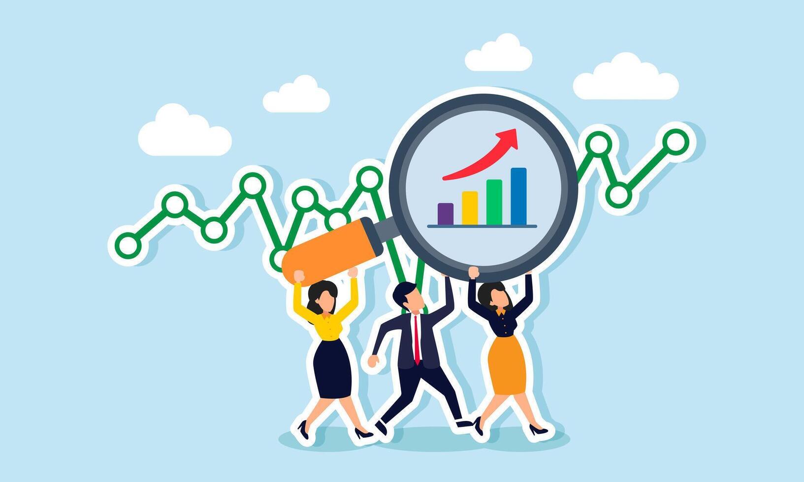 Businesspeople stand in front of a line graph, working together to lift a magnifying glass labeled rise graph, illustration of teamwork in analyzing business and financial performance Pro Vector