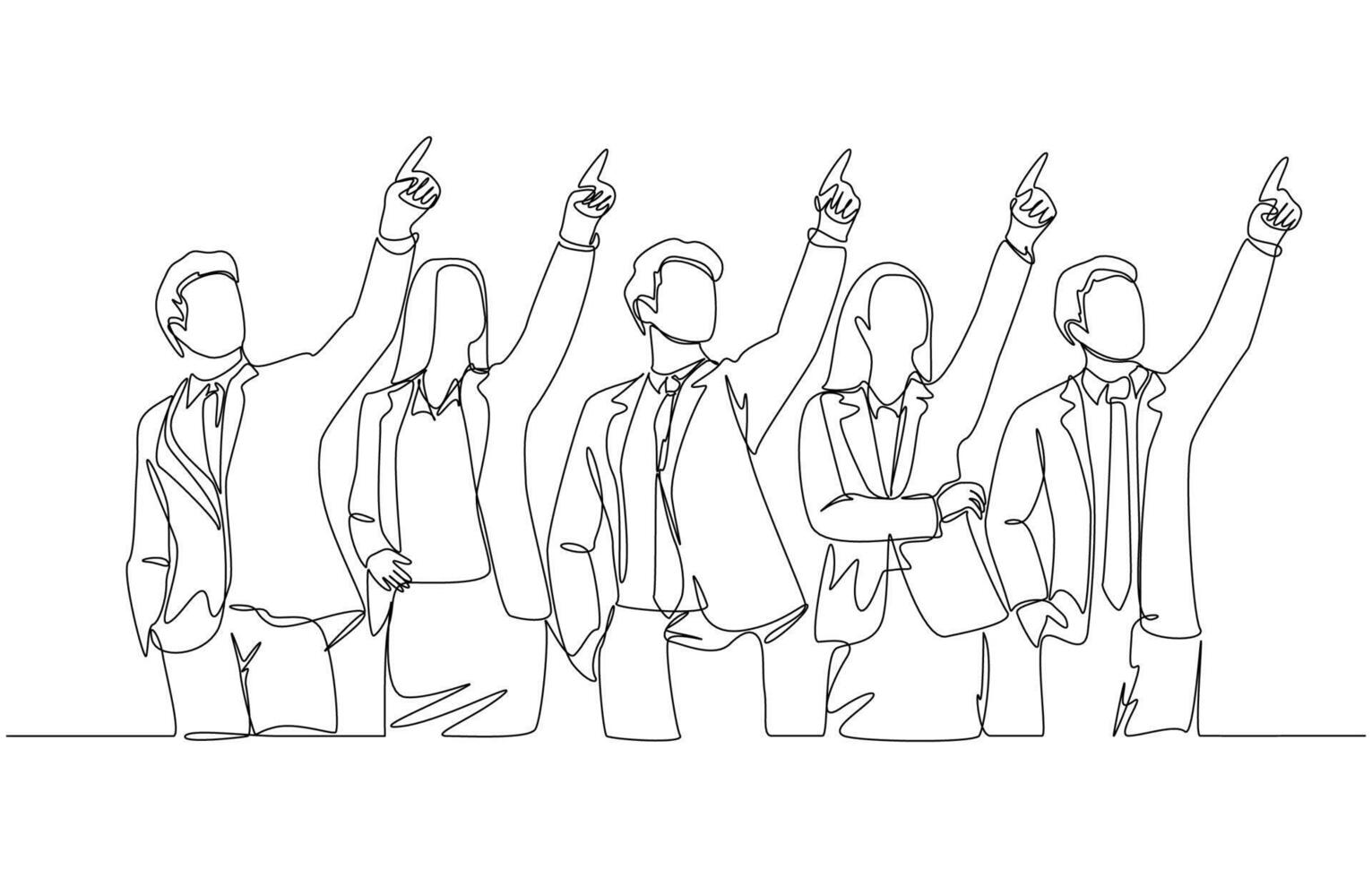 Continuous one line drawing of businesspeople pointing at same direction, business team direction concept, single line art Pro Vector
