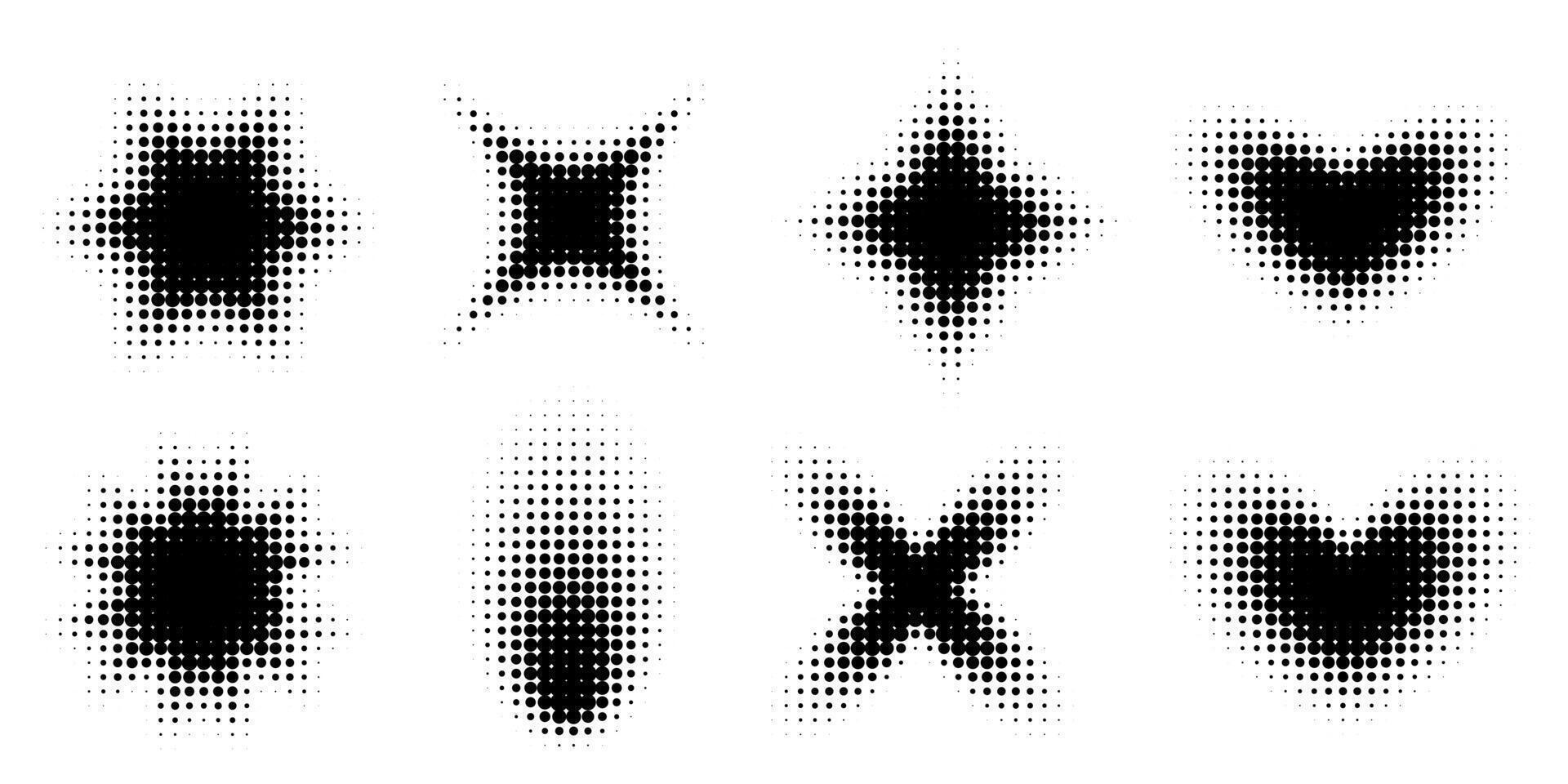 Halftone geometric icon set in black on a white background. Abstract shapes, including hearts and stars, with a retro pixelated dot pattern. Perfect for modern, minimal, and Y2K inspired designs. Pro Vector