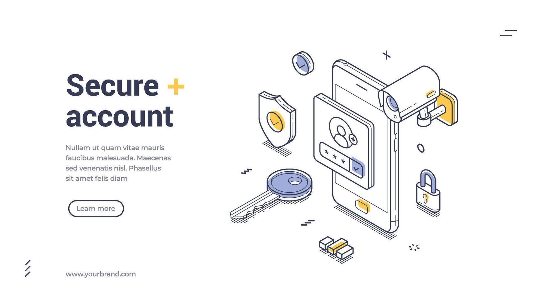 Digital security concept with smartphone, camera, and keys isometric line art web banner, landing page template Pro Vector