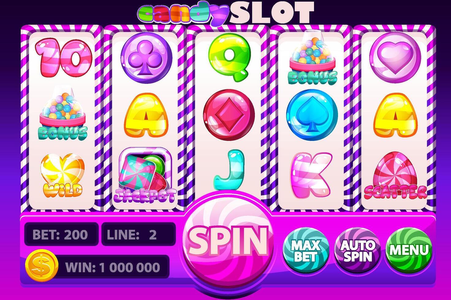 Candy Slot UI with set of slot symbols. UI game slot machine with buttons and symbols on the theme of Sweet or Candy. Pro Vector
