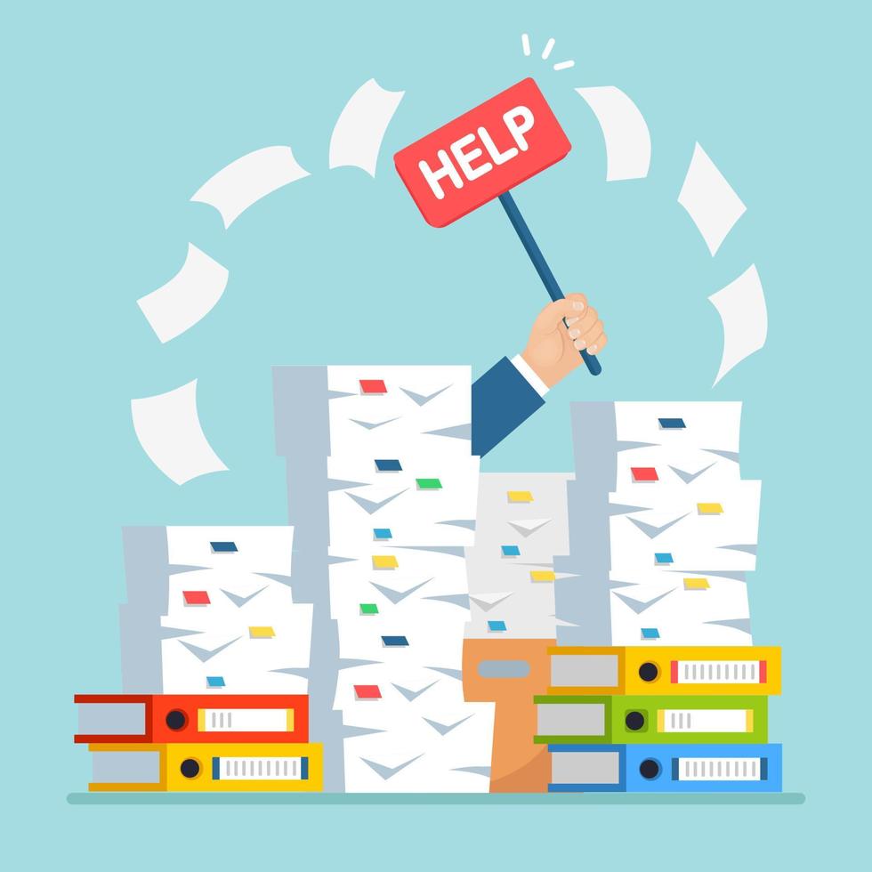 Pile of paper, document stack with carton, cardboard box. Stressed employee in heap of paperwork. Busy businessman with help sign. Bureaucracy concept. Vector cartoon design Pro Vector