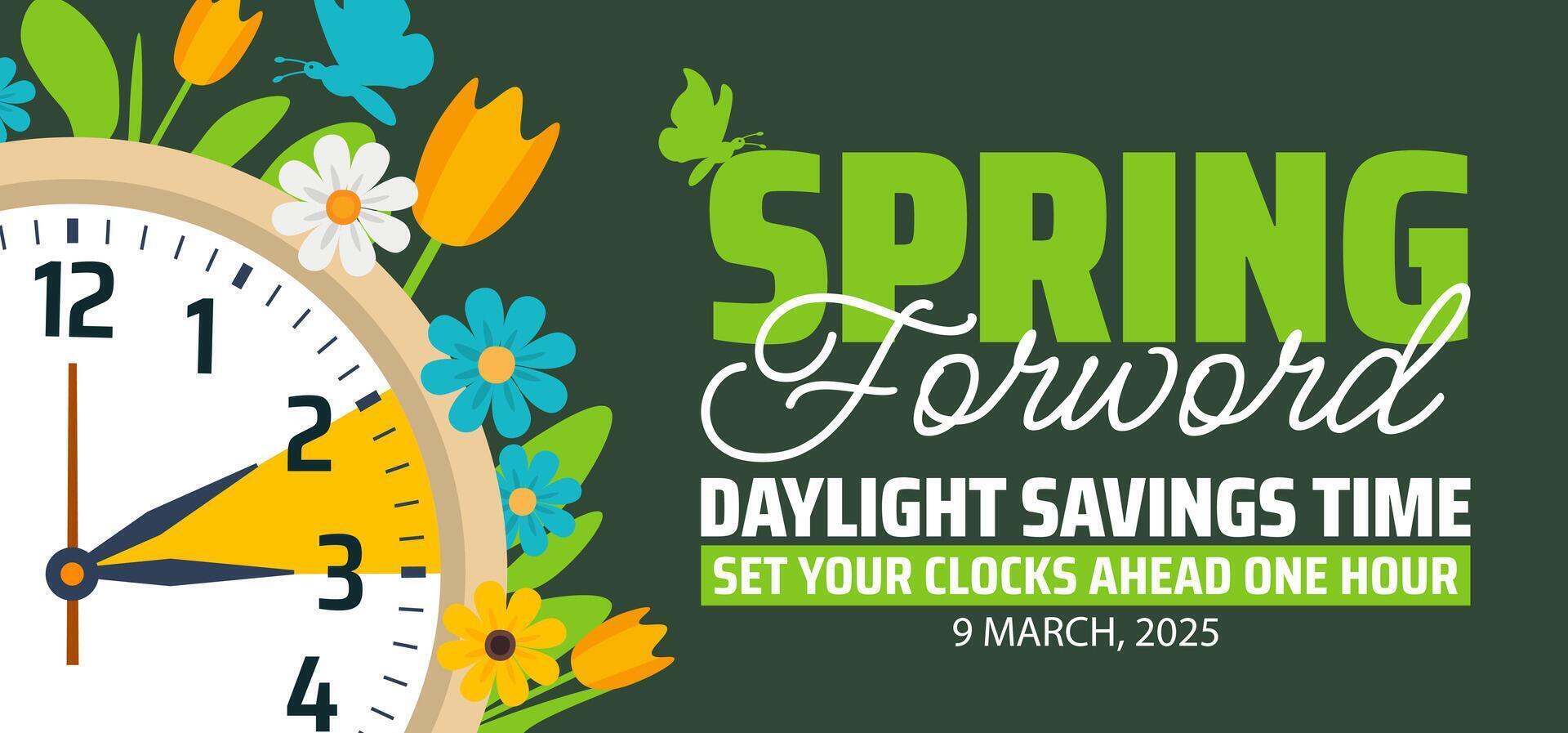 Spring Forward concept 2025 banner with flower and clock design with new design. Pro Vector