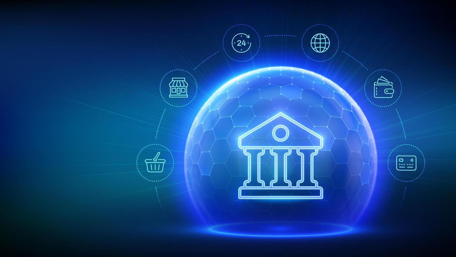 Banking. Online banking and payment. Secure transactions. Financial data protection. Cyber security. Finance networking. Glass transparent sphere with surface of hexagons with Bank icon. Pro Vector