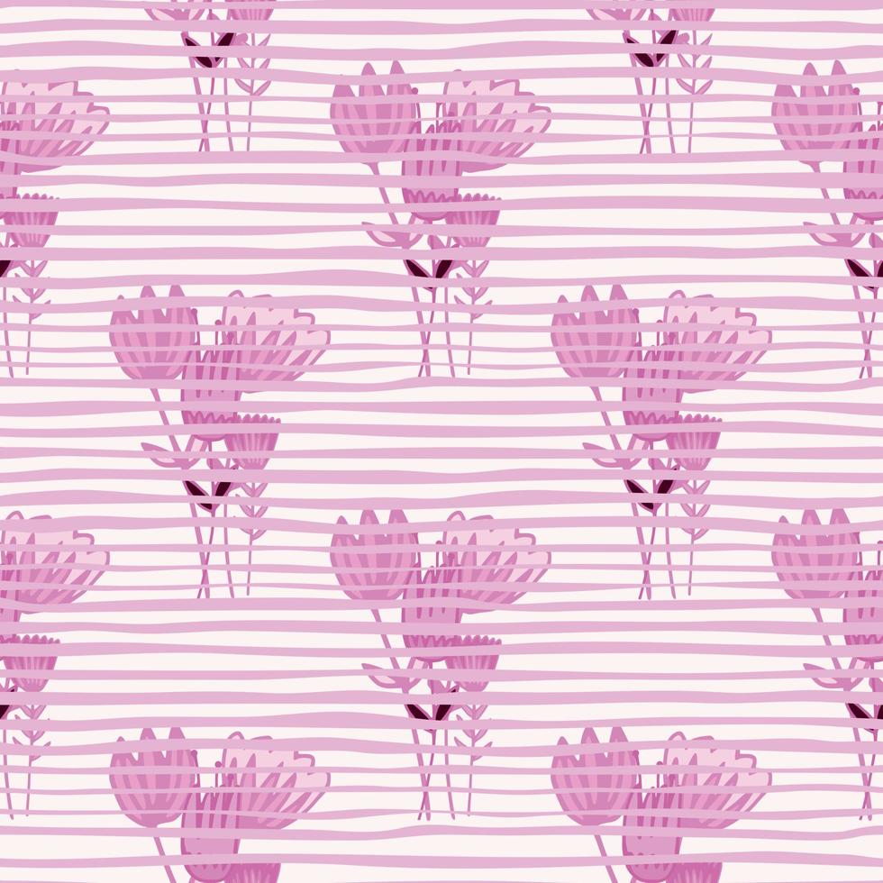 Seamless botanic pattern with pink tulip bouquet silhouettes. White background with strips. Simple spring backdrop. Pro Vector