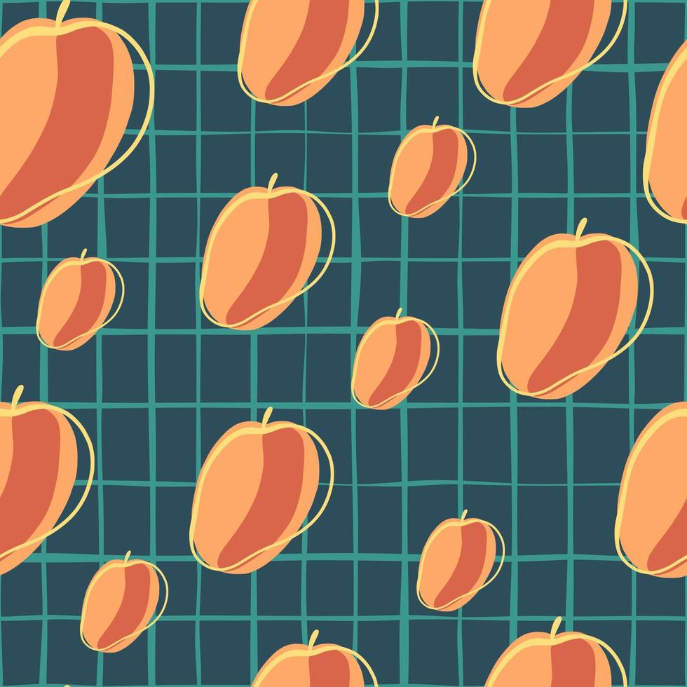 Organic seamless pattern with random orange peach elements. Blue chequered background. Simple style. Pro Vector
