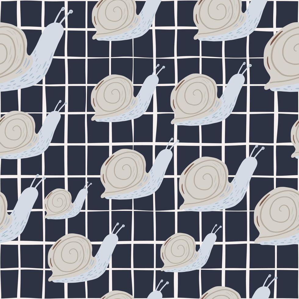 Seamless random pattern with snails. Doodle hand drawn animal shapes with spirals on dark chequered background. Pro Vector