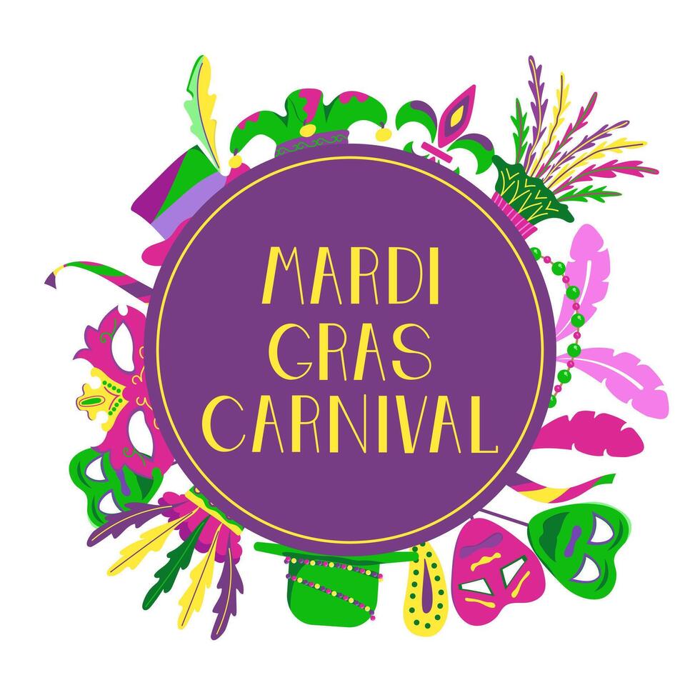 background with text in a circle with elements for Mardi Gras carnival. Bright Images of masks, feathers, hats and beads with confetti for design and logos. Pro Vector