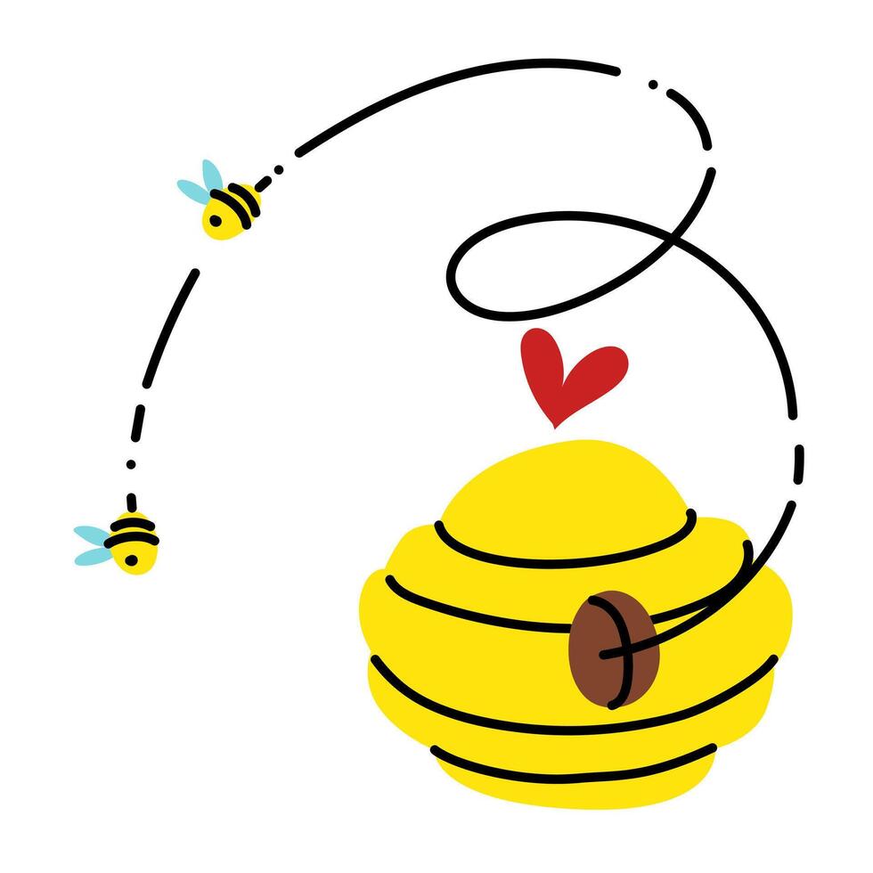 yellow bee hive, bees are flying. beehive with a heart, highlighted on a white background. beehive with bee flight lines. a house for insect bees. illustration of an isolated object. The Flying Swarm Pro Vector